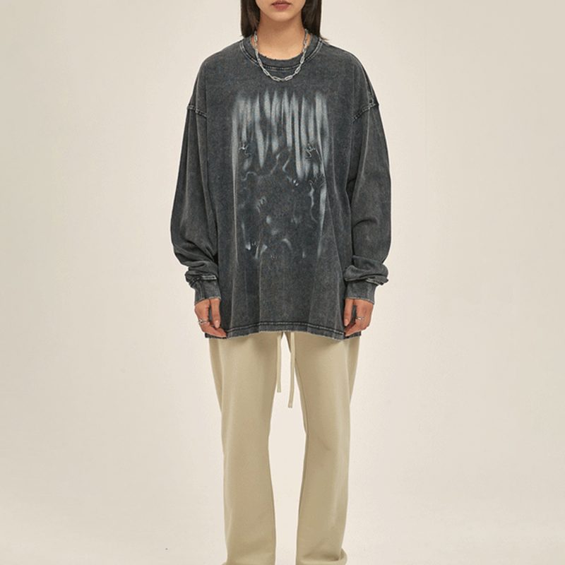Digital printing long -sleeved retro tide brand dark water washing wax dyeing old T -shirt