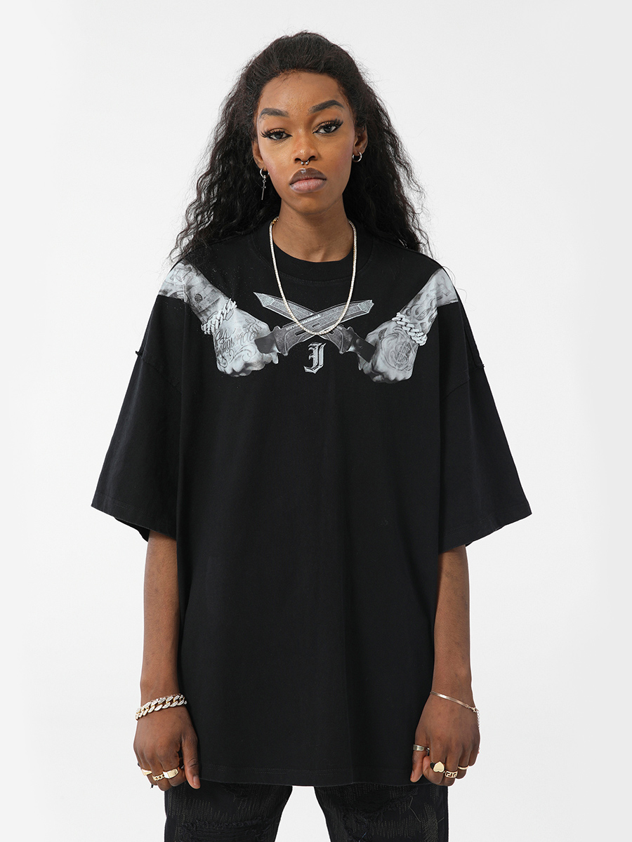 #Hip -hop double -knife printed high street American short -sleeved girl